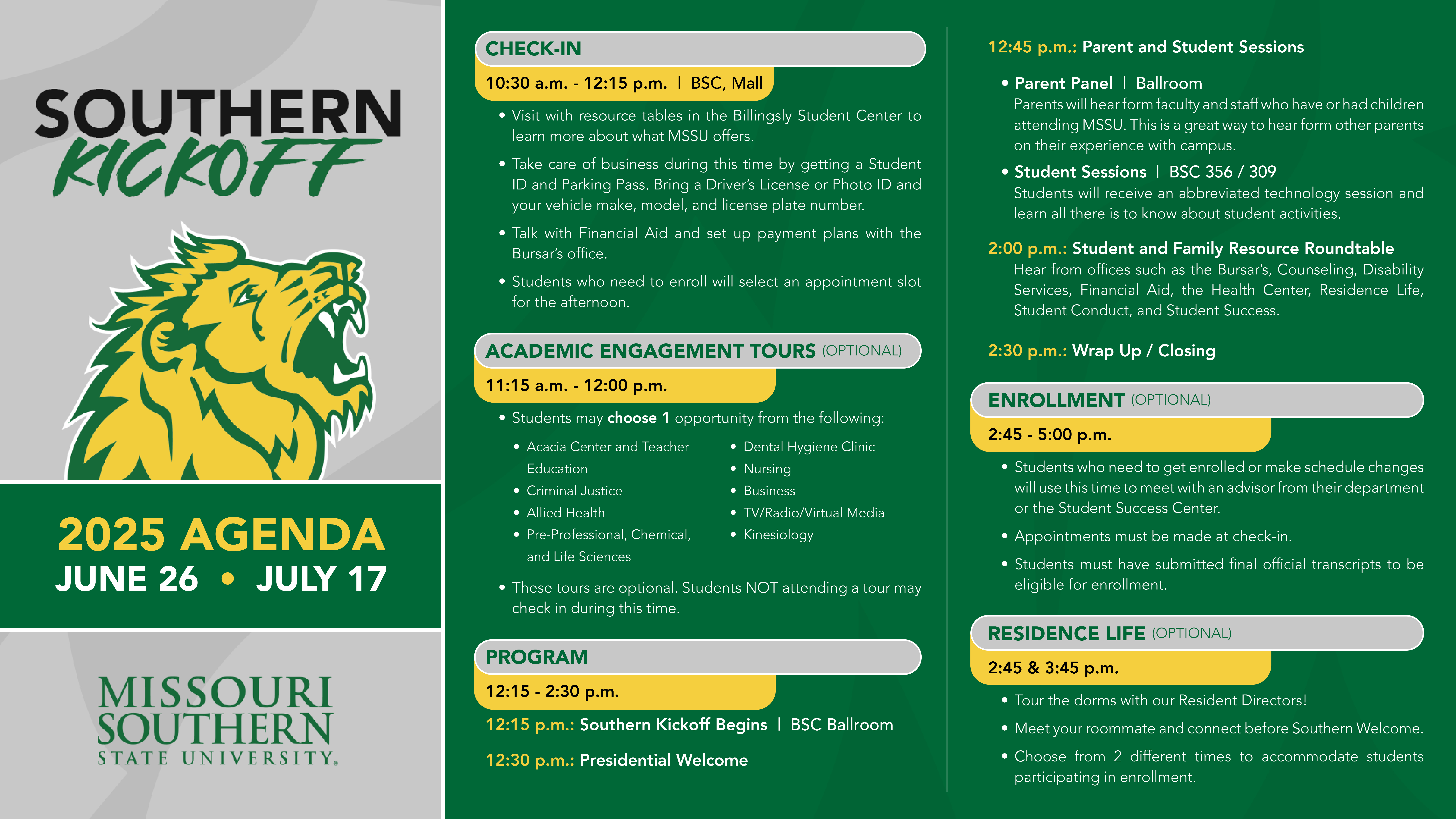 MSSU's Southern Kick-Off is a one-day event designed to help you get acquainted with campus and complete your MOSO Passport items before attending Southern Welcome in August. Our goal is to help ease the transition between high school life and your future as a Missouri Southern Lion. This is your opportunity to come get enrolled, tour our vibrant campus, discover housing options, and much more!