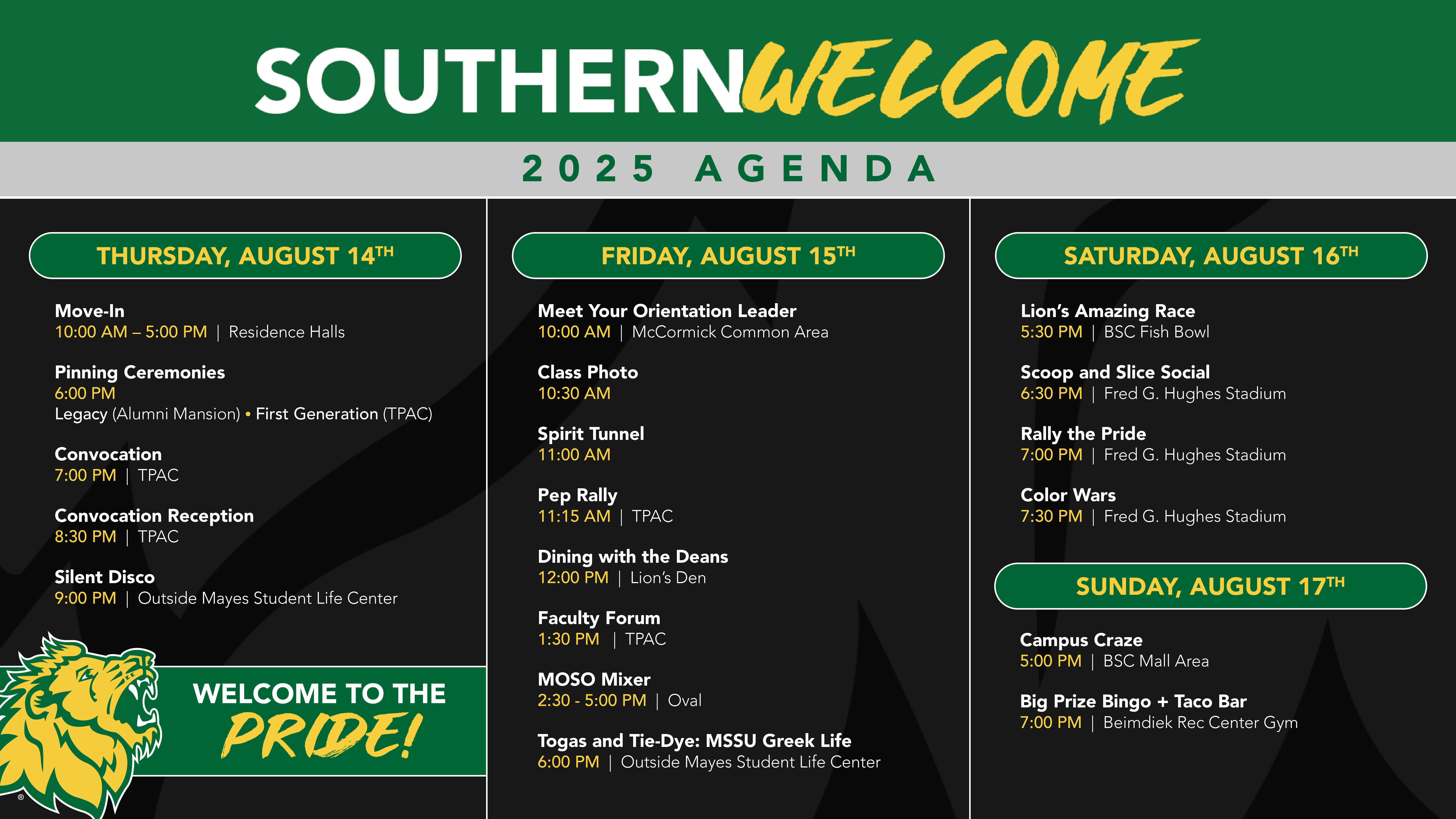 Southern Welcome is a new student orientation weekend August 14th-17th, 2025. Once you are enrolled, make sure to register to attend Southern Welcome. Students and guests will have the opportunity to explore our community and campus, and engage in activities such as pep rally, college success skills seminar, Convocation and Campus Craze. A reservation is required.